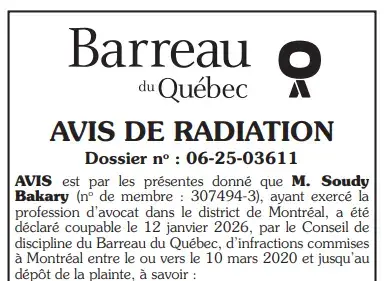 Par avis officiel daté du 6 mars 2026 et signé par Josée Roussin, directrice générale par intérim du Barreau du Québec, Me Soudy Bakary (n° de membre 307494-3), ayant exercé dans le district de Montréal, est radié du Tableau de l'Ordre pour une période de quatre mois.
